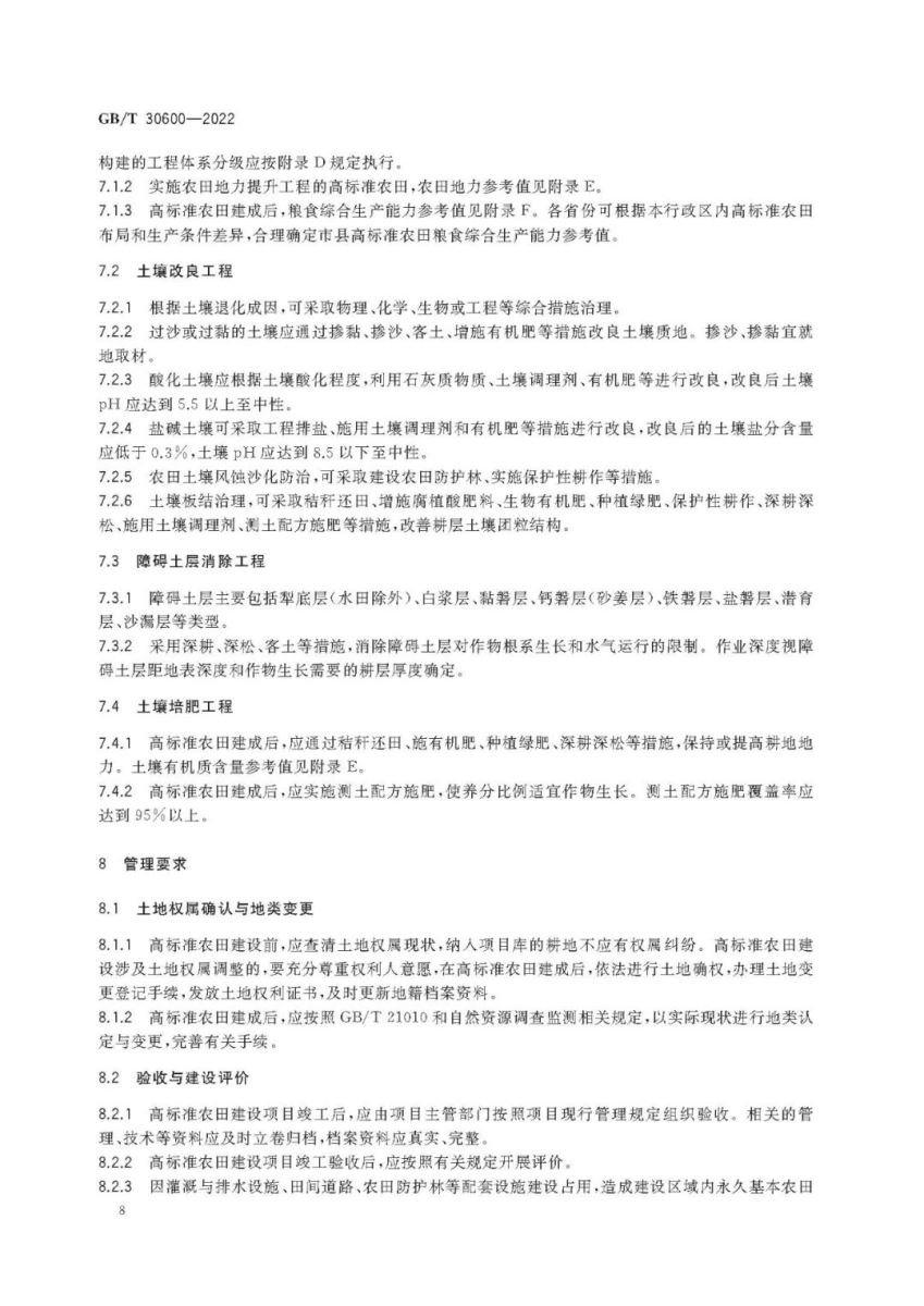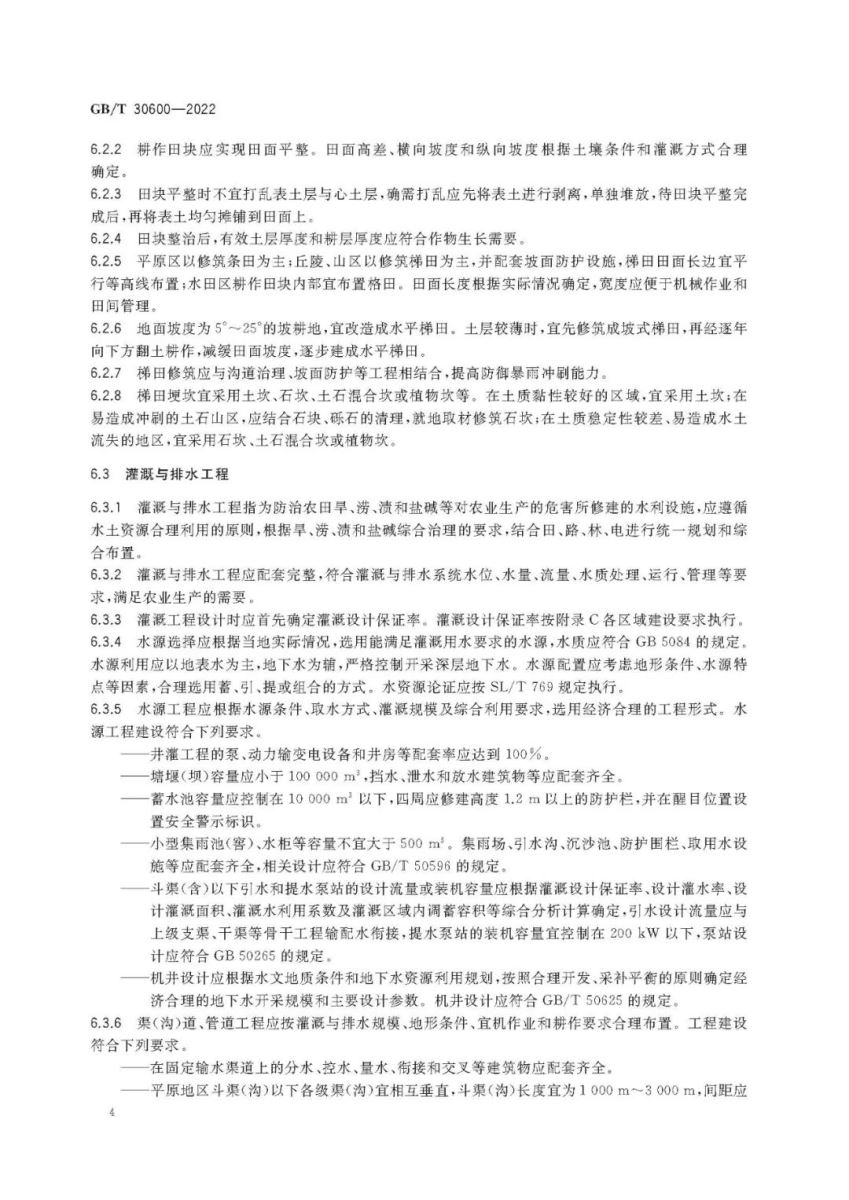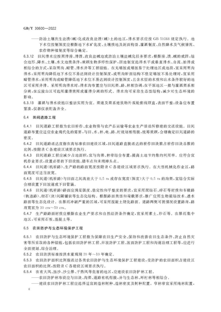 修訂后,《通則》全文共8章105條6個附錄。第一章規(guī)定了標(biāo)準(zhǔn)的適用范圍。第二章給出了《通則》中引用的相關(guān)國家與行業(yè)標(biāo)準(zhǔn)。第三章給出了8個高標(biāo)準(zhǔn)農(nóng)田建設(shè)相關(guān)的術(shù)語和定義。第四章規(guī)定了高標(biāo)準(zhǔn)農(nóng)田建設(shè)應(yīng)遵循規(guī)劃引領(lǐng)、因地制宜、數(shù)量質(zhì)量并重、綠色生態(tài)、多元參與和建管并重等6項原則。第五章根據(jù)不同區(qū)域的氣候條件、地形地貌、障礙因素和水源條件等,將全國高標(biāo)準(zhǔn)農(nóng)田建設(shè)區(qū)域劃分為東北區(qū)、黃淮海區(qū)、長江中下游區(qū)、東南區(qū)、西南區(qū)、西北區(qū)和青藏區(qū)等7個區(qū)域。本章還規(guī)定了高標(biāo)準(zhǔn)農(nóng)田建設(shè)的重點區(qū)域、限制區(qū)域和禁止區(qū)域。第六、七、八章,是《通則》的核心章節(jié)。第六章詳細(xì)規(guī)定了田塊整治、灌溉與排水、田間道路、農(nóng)田防護與生態(tài)環(huán)境保護、農(nóng)田輸配電等農(nóng)田基礎(chǔ)設(shè)施建設(shè)工程的建設(shè)內(nèi)容和標(biāo)準(zhǔn)指標(biāo);第七章詳細(xì)規(guī)定了土壤改良、障礙土層消除、土壤培肥等農(nóng)田地力提升工程的措施和標(biāo)準(zhǔn)指標(biāo);第八章詳細(xì)規(guī)定了土地權(quán)屬確認(rèn)與地類變更、驗收與建設(shè)評價、耕地質(zhì)量評價監(jiān)測與信息化管理、建后管護、農(nóng)業(yè)科技配套與應(yīng)用等管理要求。