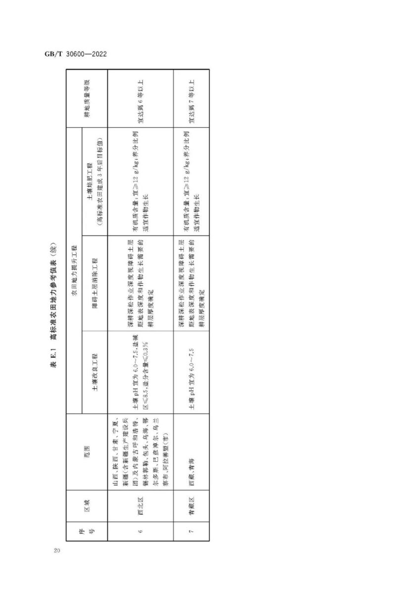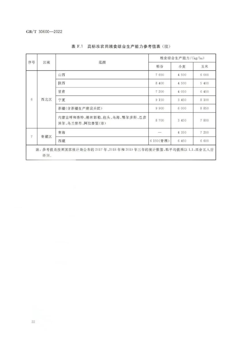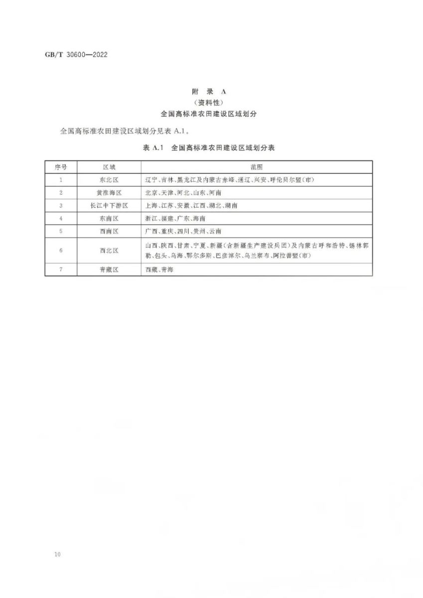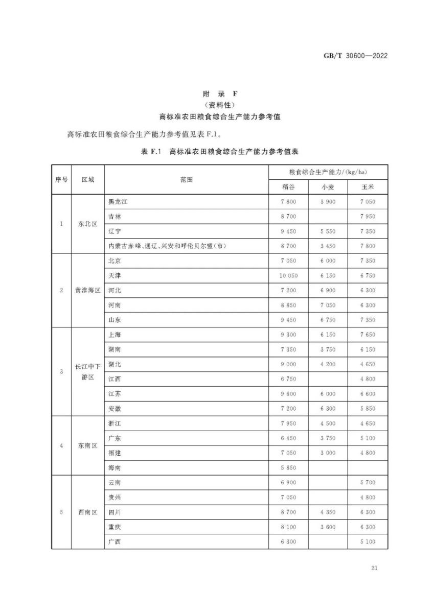 《通則》設(shè)6個附錄。附錄A 全國高標(biāo)準(zhǔn)農(nóng)田建設(shè)區(qū)域劃分表,為資料性附錄,規(guī)定了七大區(qū)域分別包括的省(區(qū)、市)。附錄B 高標(biāo)準(zhǔn)農(nóng)田基礎(chǔ)設(shè)施建設(shè)工程體系表,為規(guī)范性附錄,詳細(xì)劃分了農(nóng)田基礎(chǔ)設(shè)施建設(shè)工程三級工程體系。附錄C 各區(qū)域高標(biāo)準(zhǔn)農(nóng)田基礎(chǔ)設(shè)施工程建設(shè)要求,為規(guī)范性附錄,分區(qū)域詳細(xì)規(guī)定了五類農(nóng)田基礎(chǔ)設(shè)施工程分別應(yīng)達(dá)到的建設(shè)標(biāo)準(zhǔn)指標(biāo)。附錄D 高標(biāo)準(zhǔn)農(nóng)田地力提升工程體系表,為規(guī)范性附錄,詳細(xì)劃分了農(nóng)田地力提升工程三級工程體系。附錄E 高標(biāo)準(zhǔn)農(nóng)田地力參考值表,為資料性附錄,分區(qū)域詳細(xì)規(guī)定了高標(biāo)準(zhǔn)農(nóng)田應(yīng)達(dá)到的地力標(biāo)準(zhǔn)值或三年后的目標(biāo)值,應(yīng)達(dá)到的耕地質(zhì)量等級。附錄F 高標(biāo)準(zhǔn)農(nóng)田糧食綜合生產(chǎn)能力參考值表,為資料性附錄,分區(qū)域分省給出了高標(biāo)準(zhǔn)農(nóng)田稻谷、小麥、玉米三大谷物應(yīng)達(dá)到的糧食綜合生產(chǎn)能力。