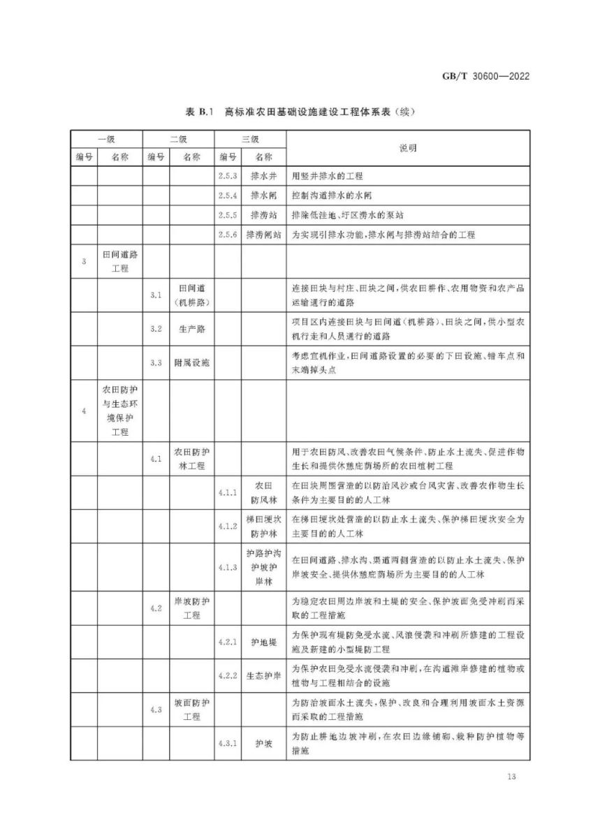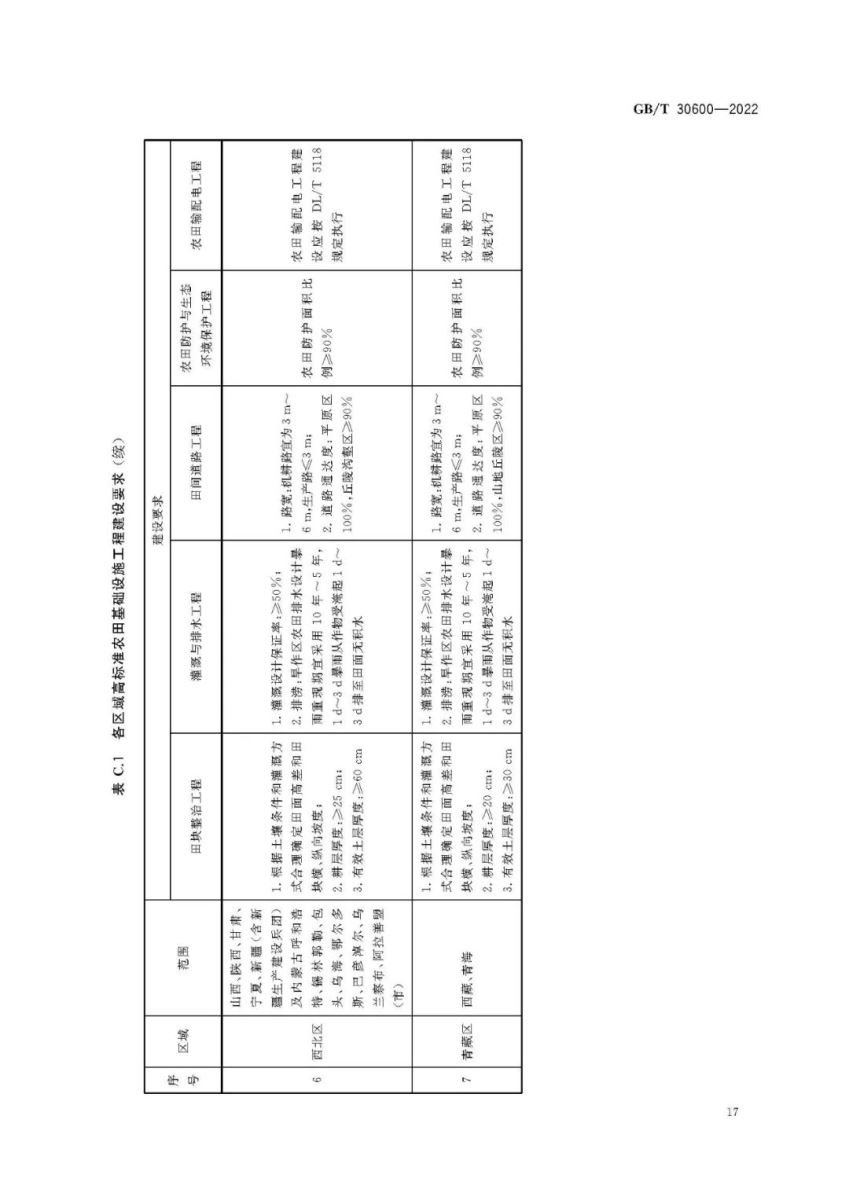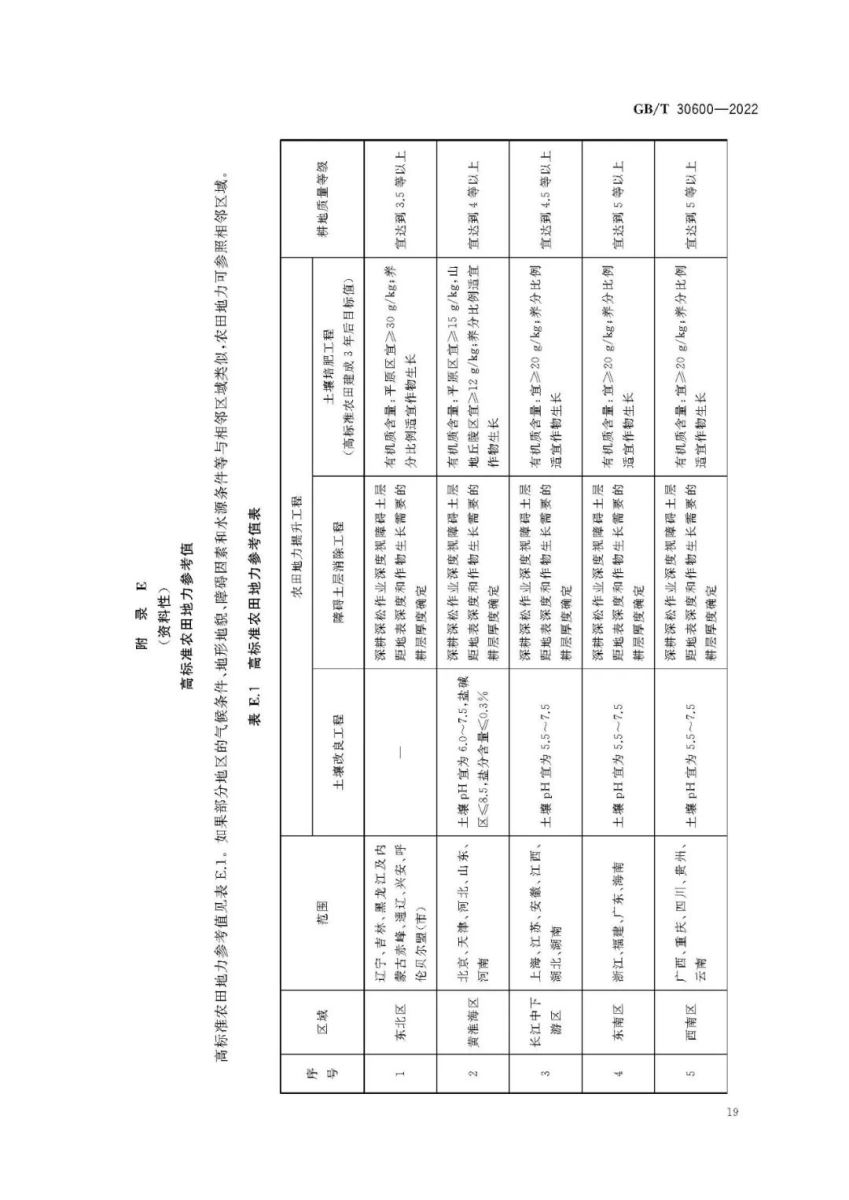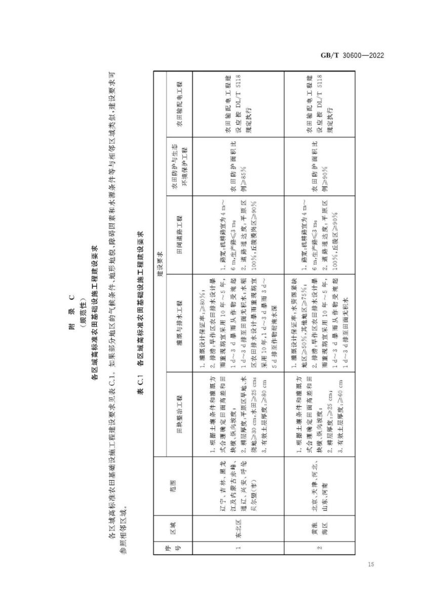 《通則》設(shè)6個附錄。附錄A 全國高標(biāo)準(zhǔn)農(nóng)田建設(shè)區(qū)域劃分表,為資料性附錄,規(guī)定了七大區(qū)域分別包括的省(區(qū)、市)。附錄B 高標(biāo)準(zhǔn)農(nóng)田基礎(chǔ)設(shè)施建設(shè)工程體系表,為規(guī)范性附錄,詳細(xì)劃分了農(nóng)田基礎(chǔ)設(shè)施建設(shè)工程三級工程體系。附錄C 各區(qū)域高標(biāo)準(zhǔn)農(nóng)田基礎(chǔ)設(shè)施工程建設(shè)要求,為規(guī)范性附錄,分區(qū)域詳細(xì)規(guī)定了五類農(nóng)田基礎(chǔ)設(shè)施工程分別應(yīng)達(dá)到的建設(shè)標(biāo)準(zhǔn)指標(biāo)。附錄D 高標(biāo)準(zhǔn)農(nóng)田地力提升工程體系表,為規(guī)范性附錄,詳細(xì)劃分了農(nóng)田地力提升工程三級工程體系。附錄E 高標(biāo)準(zhǔn)農(nóng)田地力參考值表,為資料性附錄,分區(qū)域詳細(xì)規(guī)定了高標(biāo)準(zhǔn)農(nóng)田應(yīng)達(dá)到的地力標(biāo)準(zhǔn)值或三年后的目標(biāo)值,應(yīng)達(dá)到的耕地質(zhì)量等級。附錄F 高標(biāo)準(zhǔn)農(nóng)田糧食綜合生產(chǎn)能力參考值表,為資料性附錄,分區(qū)域分省給出了高標(biāo)準(zhǔn)農(nóng)田稻谷、小麥、玉米三大谷物應(yīng)達(dá)到的糧食綜合生產(chǎn)能力。